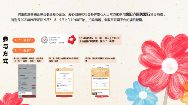 绵阳市慈善联合总会加入四川省慈善联合总会“子母计划”在腾讯公益平台上线了“绵阳济困关爱行”项目,总会将在9月5日“中华慈善日”和9月7、8、9日-“99公益日”期间,通过公众号、官网、工作群、朋友圈等广泛转发“绵阳济困关爱行”项目,同时将开展线下地推活动,争取发动更多的人献出自己的爱心。
